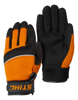 Komfortowe rękawice robocze w rozmiarze L z czarnej skóry syntetycznej, pomarańczowego Spandexu i neoprenu.